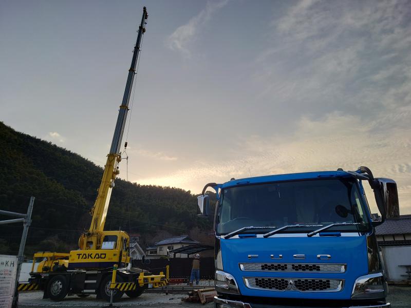 雨上がりの現場は泥まみれになりトラックは泥でスリップして大変です。